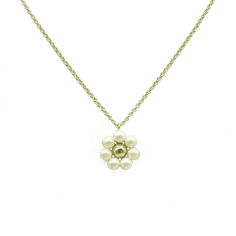 Collar con dije tipo flor con perlas. Aleación de metales, baño de oro de 18k con hipoalergénico. Tamaño 41 cm + 8 cm de extensor.