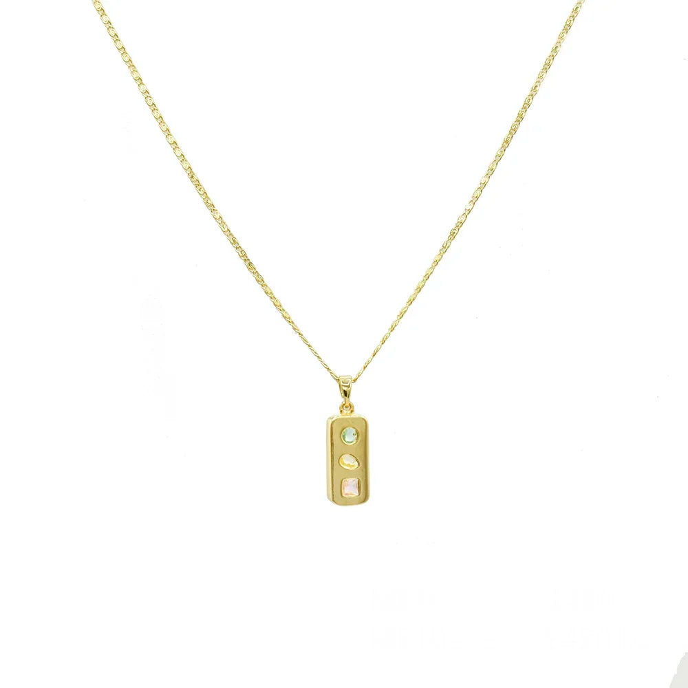 Collar con dije rectangulo con 3 cristales coloridos. Aleación de metales, baño de oro de 18k con hipoalergénico. Tamaño 40 cm +10 cm de extensor.